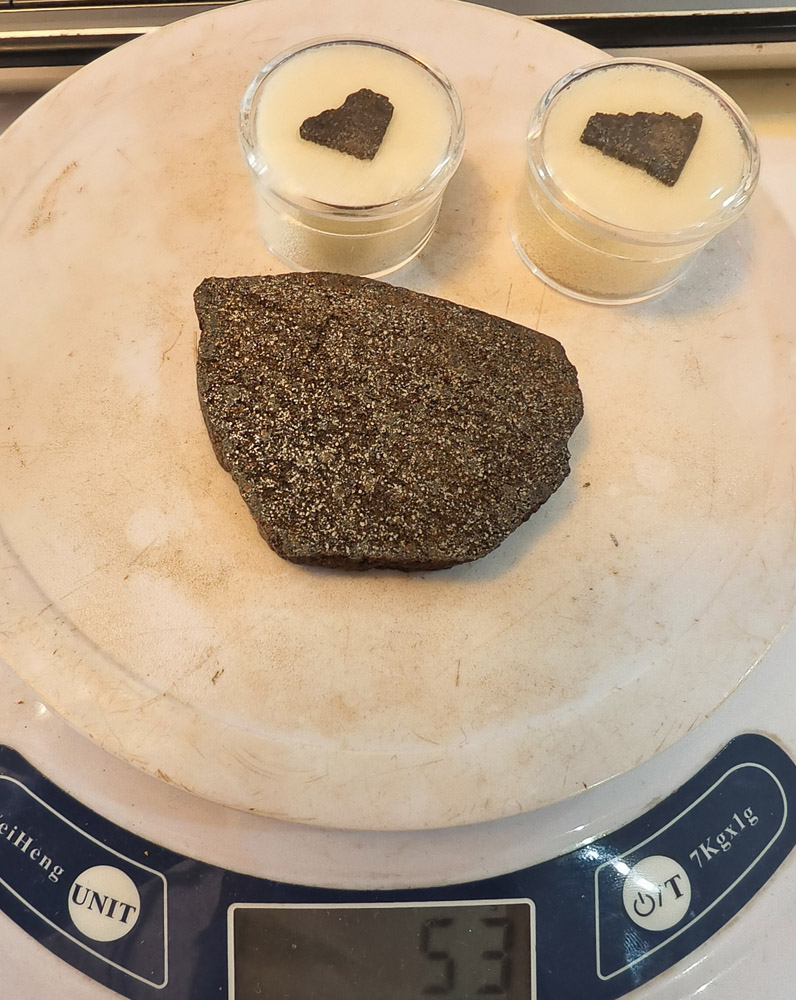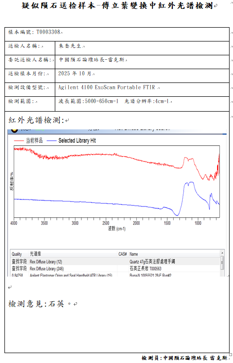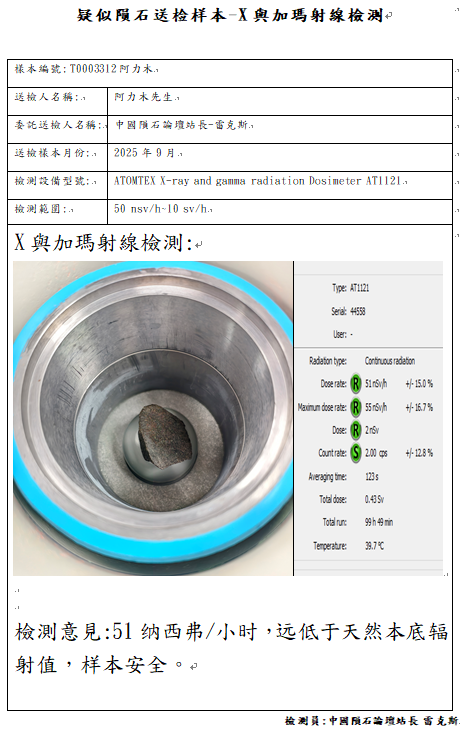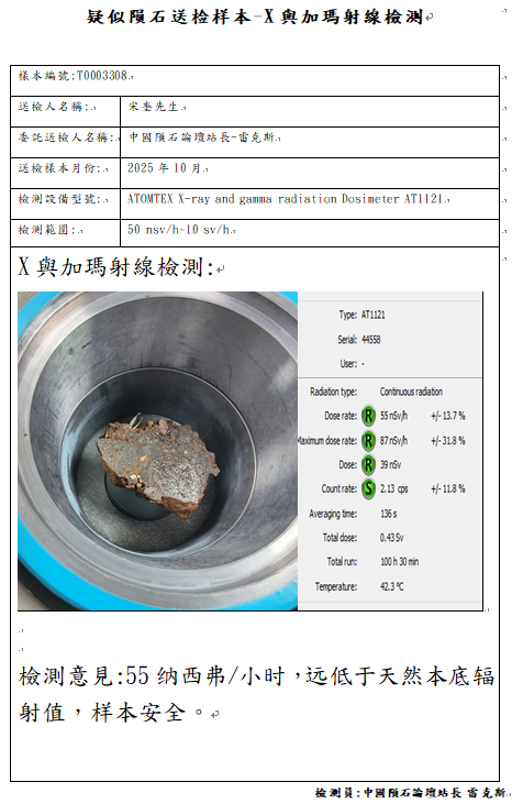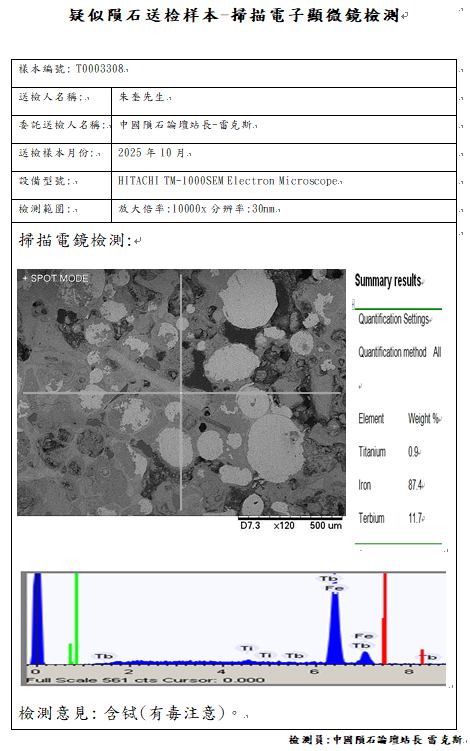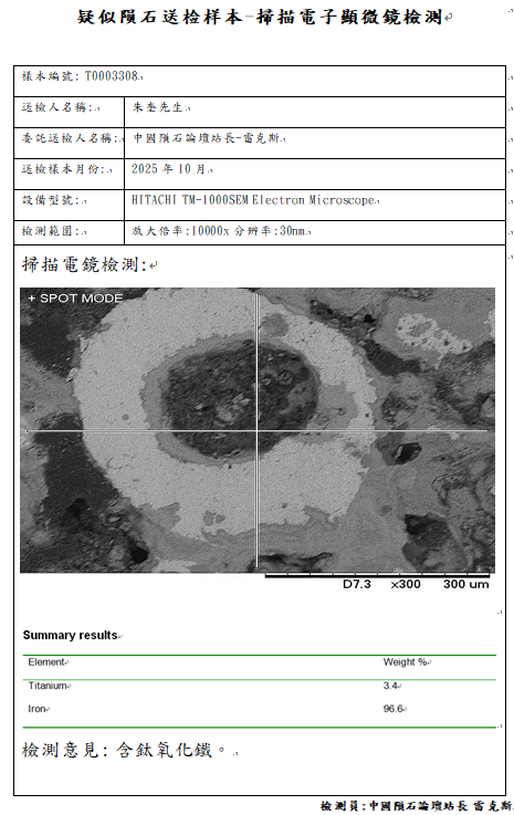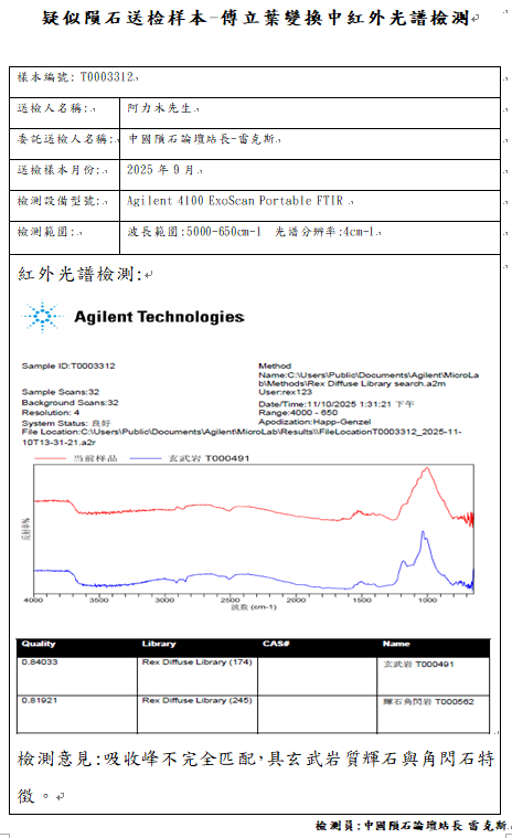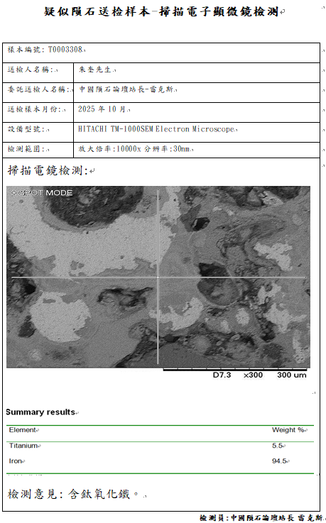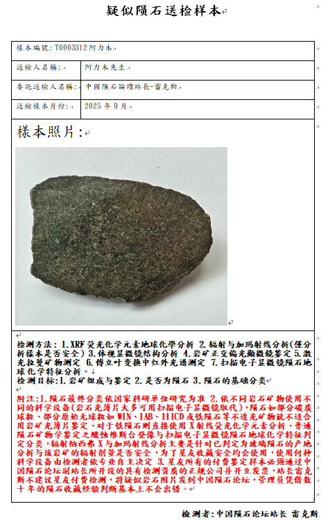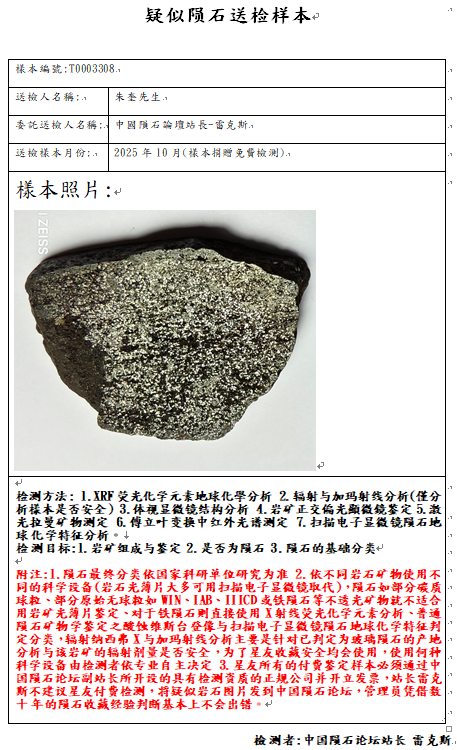 样本已提供中国科学院复测,因为不是陨石中国科学院无法开立陨石捐献荣誉证书与申报国际命名,感谢朱奎星友大气的捐赠一公斤的样本,中国陨石论坛提供免费的检测但很遗憾检测结果不是陨石,与朱先生商量后退回部分样本,少量样本给予站长雷克斯继续研究,不管是不是陨石,中国陨石论坛感谢朱奎先生的信任与支持,说实话,这颗要不是做了岩矿鉴定,站长雷克斯自己也不敢相信,它竟然不是陨石。