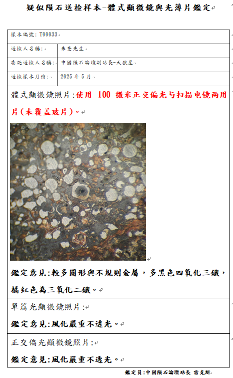 - 样本于岩矿鉴定中并未发现其他应存在于无球粒陨石中的矿物,如磷酸盐、铁硫化物等