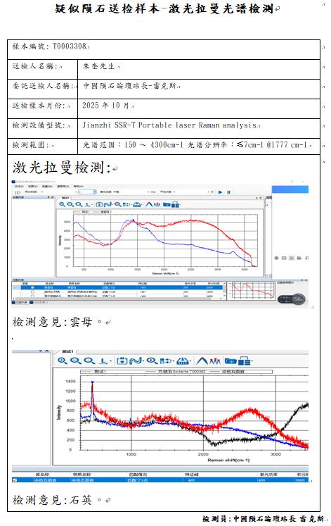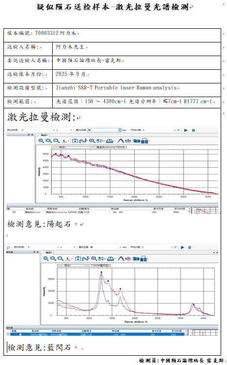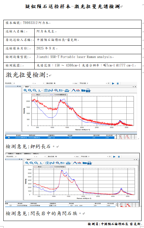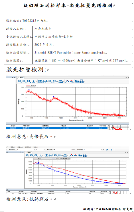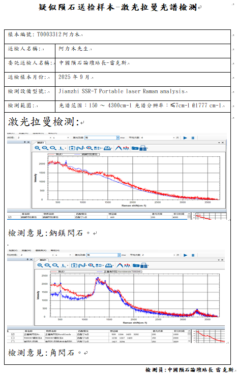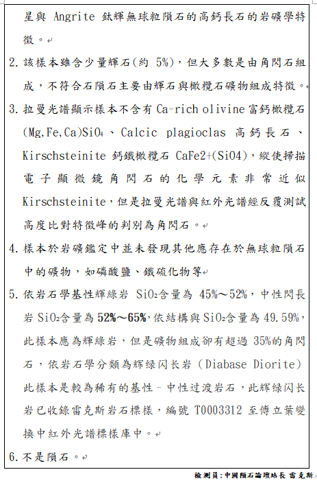 - 拉曼光谱显示样本不含有Ca-rich olivine富钙橄榄石(Mg,Fe,Ca)SiO4、Calcic plagioclas高钙长石、Kirschsteinite钙铁橄榄石CaFe2+(SiO4),纵使扫描电子显微镜角闪石的化学元素非常近似Kirschsteinite,但是拉曼光谱与红外光谱经反复测试高度比对特征峰的判别为角闪石。