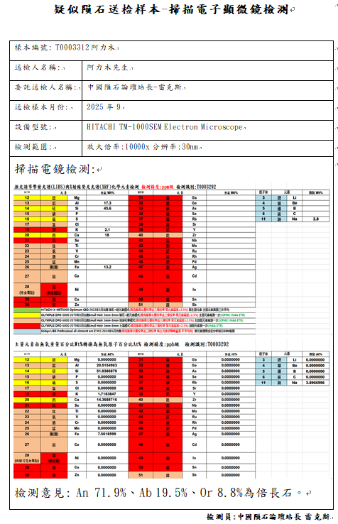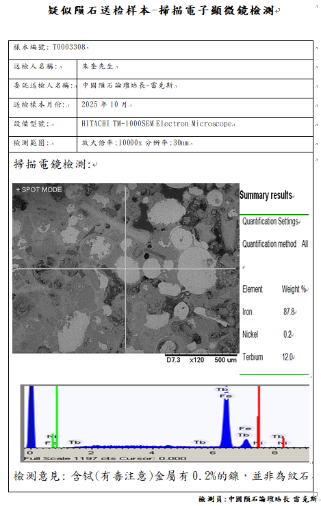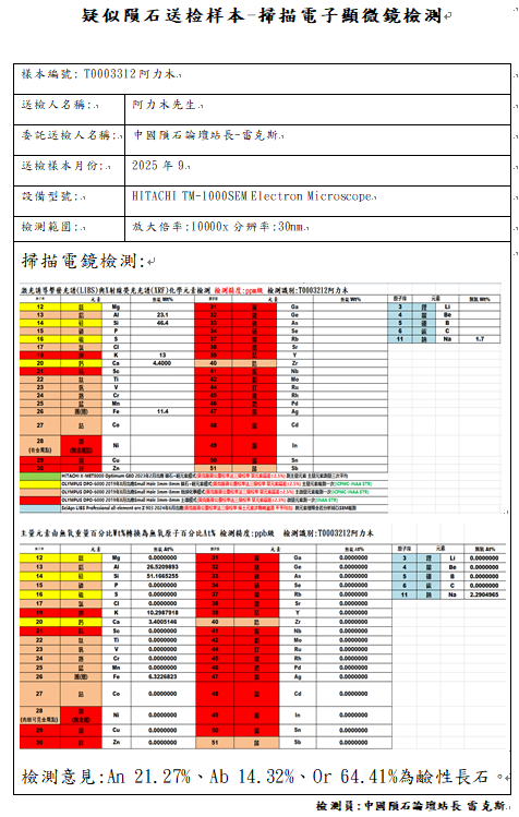 具有大量金属反光点且符合陨石镍含量地球化学特征的岩石,中国陨石论坛站长雷克斯由T0003308与T0003312疑似陨石样本检测结果得知,镍含量并不可靠!