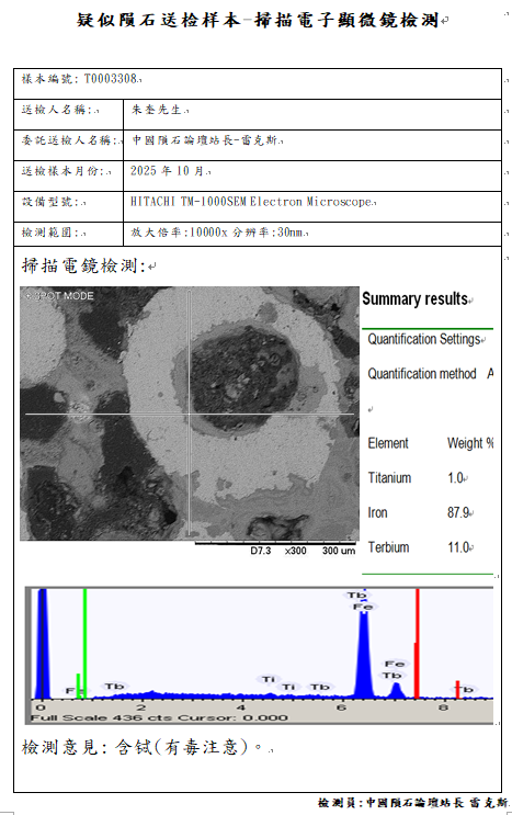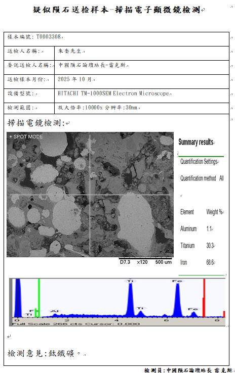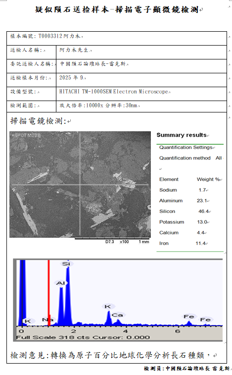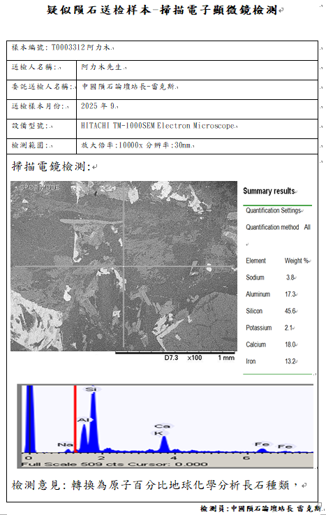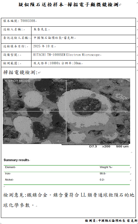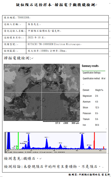 扫描电镜检测结论:虽然样本的物理特征具有强磁性、切面具有密密麻麻的金属点、镍含量0.23Wt%符合LL类球粒石陨石地球化学参数范围,但是经岩矿学鉴定金属并非铁镍纹石,未发现陨石中的所有的主要矿物,鉴定结论不是陨石。