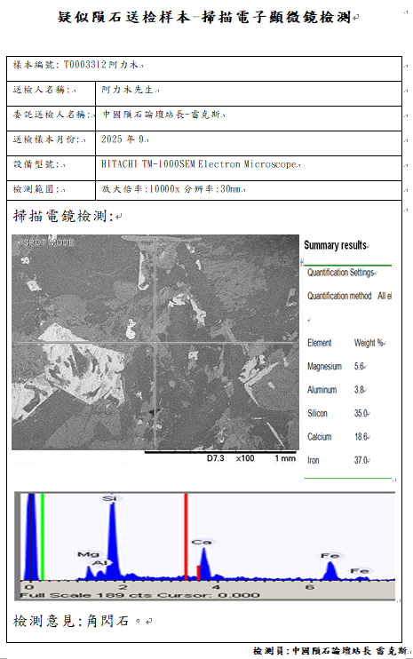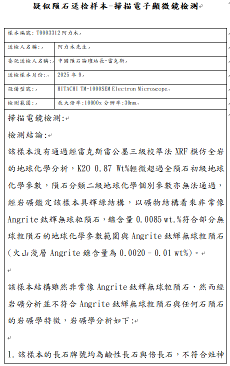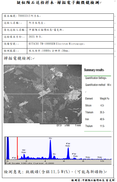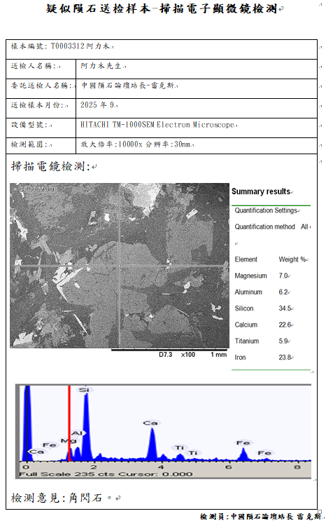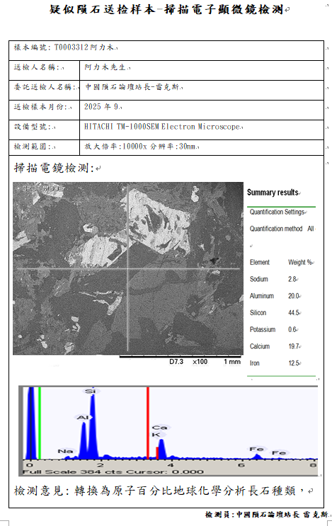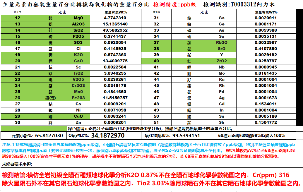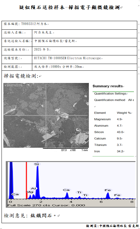 T0003312号阿力木提供的非常像Angrite钛辉无球粒陨石的岩石样本岩矿岩矿检测报告如下: