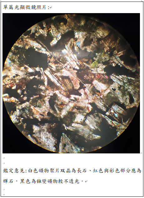 - 依岩石学基性辉绿岩SiO₂含量为 45%~52%,中性闪长岩SiO₂含量为52%~65%,依结构与SiO₂含量为49.59%,此样本应为辉绿岩,但是矿物组成却有超过35%的角闪石,依岩石学分类为辉绿闪长岩(Diabase Diorite)此样本是较为稀有的基性–中性过渡岩石,此辉绿闪长岩已收录雷克斯岩石标样,编号T0003312至傅立叶变换中红外光谱标样库中。