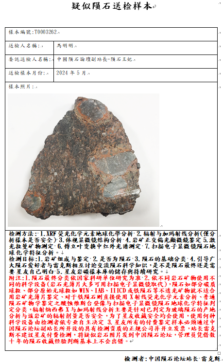 申请快速国际命名与中国科学院陨石捐赠荣誉证书请电:站长雷克斯139-11558898,陨石检测请电:副站长世界陨石市场189-11969162(同微信号)或论坛各管理员,检测报告须在论坛公示(管理员私下检测造成纠纷责任自负),详情请观看论坛公告区。