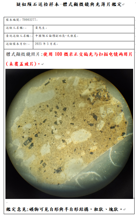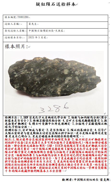 申请快速国际命名与中国科学院陨石捐赠荣誉证书请电:站长雷克斯139-11558898,陨石检测请电:副站长世界陨石市场189-11969162(同微信号)或论坛各管理员,检测报告须在论坛公示(管理员私下检测造成纠纷责任自负),详情请观看论坛公告区。