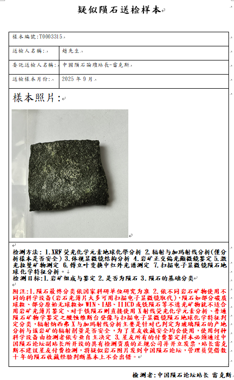 申请快速国际命名与中国科学院陨石捐赠荣誉证书请电:站长雷克斯139-11558898,陨石检测请电:副站长世界陨石市场189-11969162(同微信号)或论坛各管理员,检测报告须在论坛公示(管理员私下检测造成纠纷责任自负),详情请观看论坛公告区。
