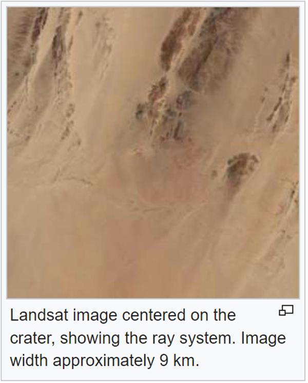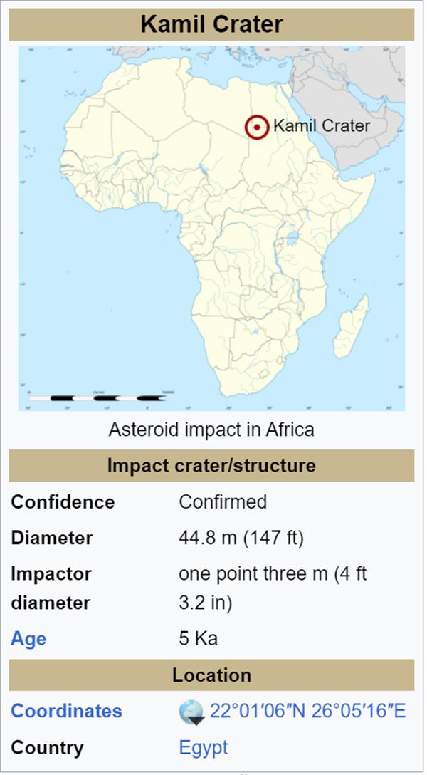 卡米尔陨石坑位于北纬22°1'5.89",东经26°5'15.69"。