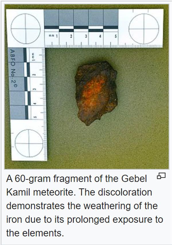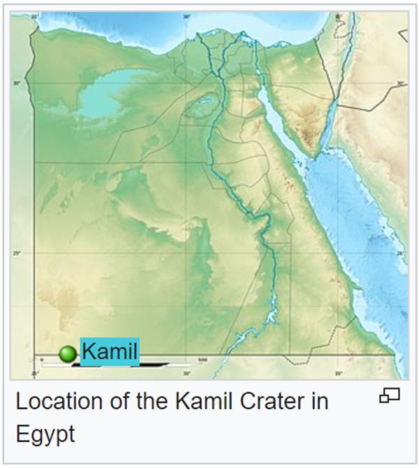 卡米尔陨石坑是一个宽 44.8 米(147 英尺)、深 15.8 米(52 英尺)(原始深度,目前部分被沙子覆盖)的陨石撞击坑,位于埃及 新河谷省西南部的东乌韦纳特沙漠, 距苏丹边界以北仅 0.6 公里(0.4 英里),海拔 600 米(2000 英尺)。文森佐-德-米歇尔(Vincenzo de Michele,意大利 米兰 自然历史博物馆前馆长)于 2008 年利用谷歌地球卫星图像对其进行了定位。
