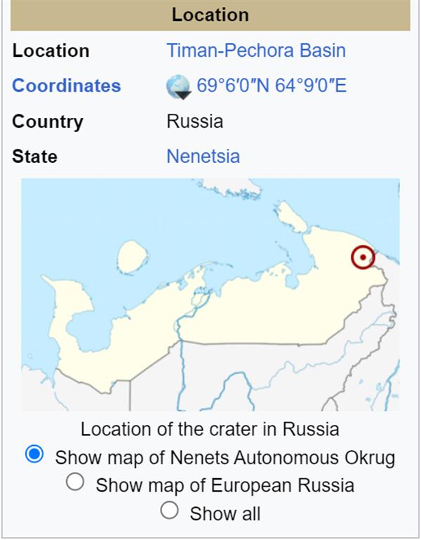由于侵蚀严重,目前直径为 65 公里(40 英里),但侵蚀前直径被认为最初为 120 公里(75 英里)。它的年龄估计为 70.3 ± 220 万年(白垩纪晚期)。位于陨石坑东北部巴伊达拉塔湾 (Baydaratskaya) 海岸的撞击岩露头意味着该陨石坑的原始大小可能是地球上第四大。 陨石坑没有暴露在地表。